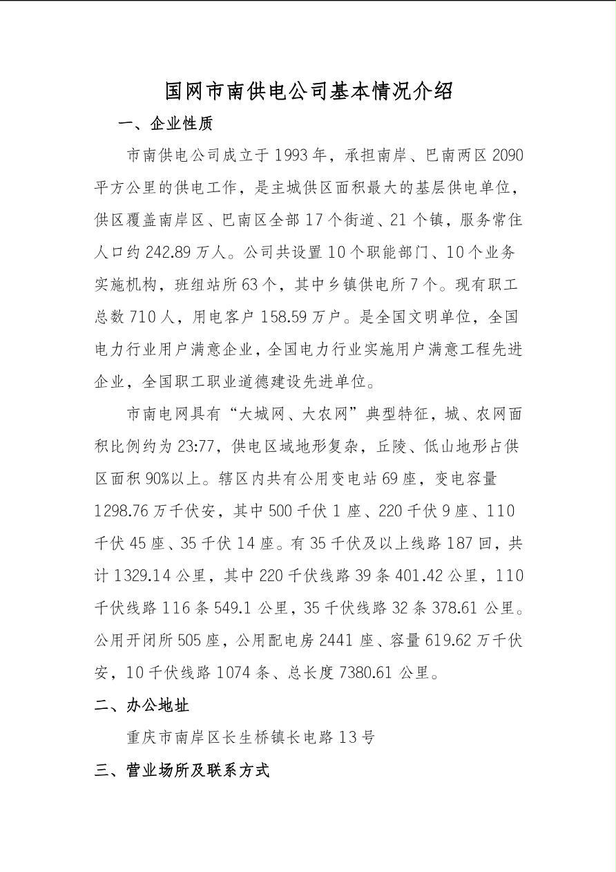 国网重庆市电力公司市南供电分公司基本情况介绍
