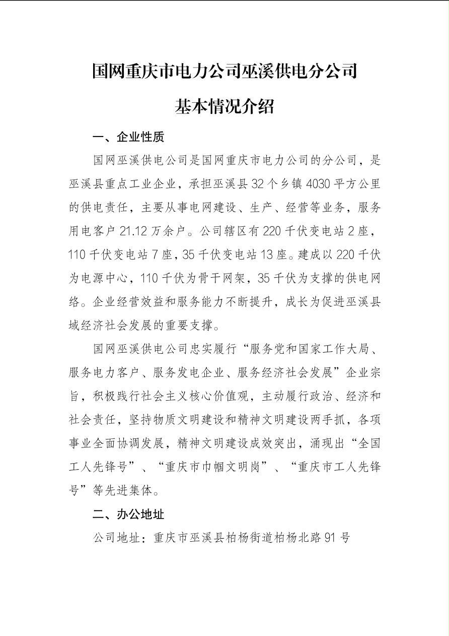 国网重庆市电力公司巫溪供电分公司基本情况介绍