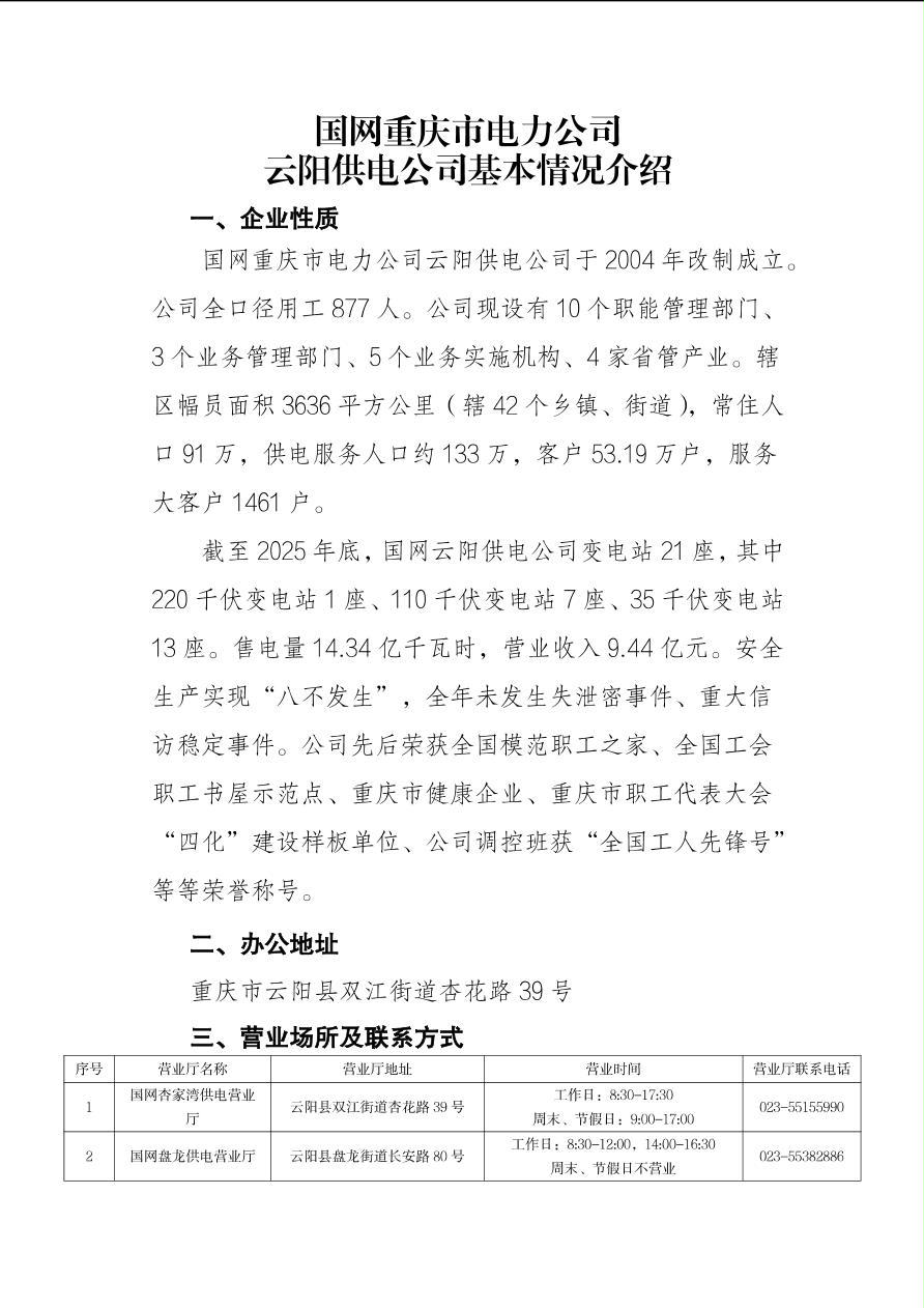 国网重庆市电力公司云阳供电分公司基本情况介绍