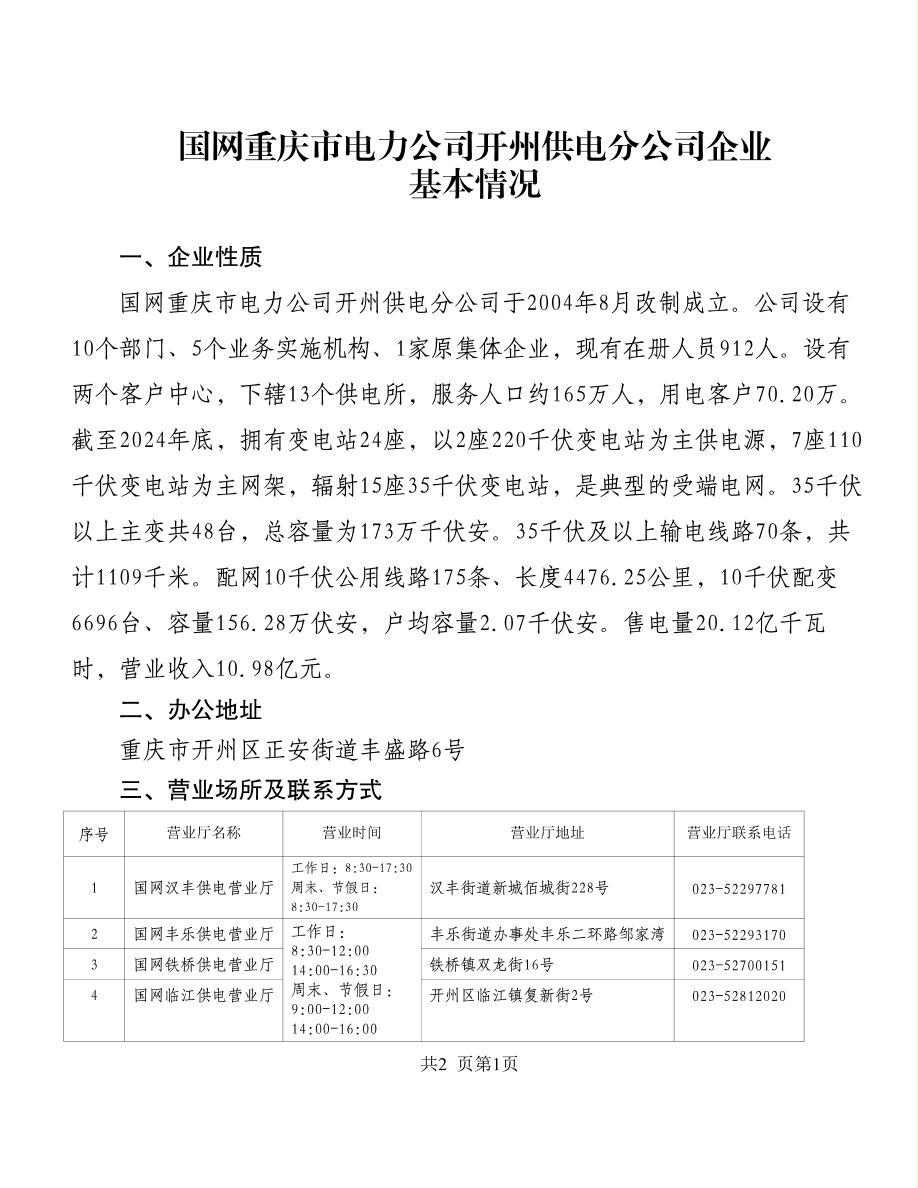 国网重庆市电力公司开州供电分公司基本情况介绍