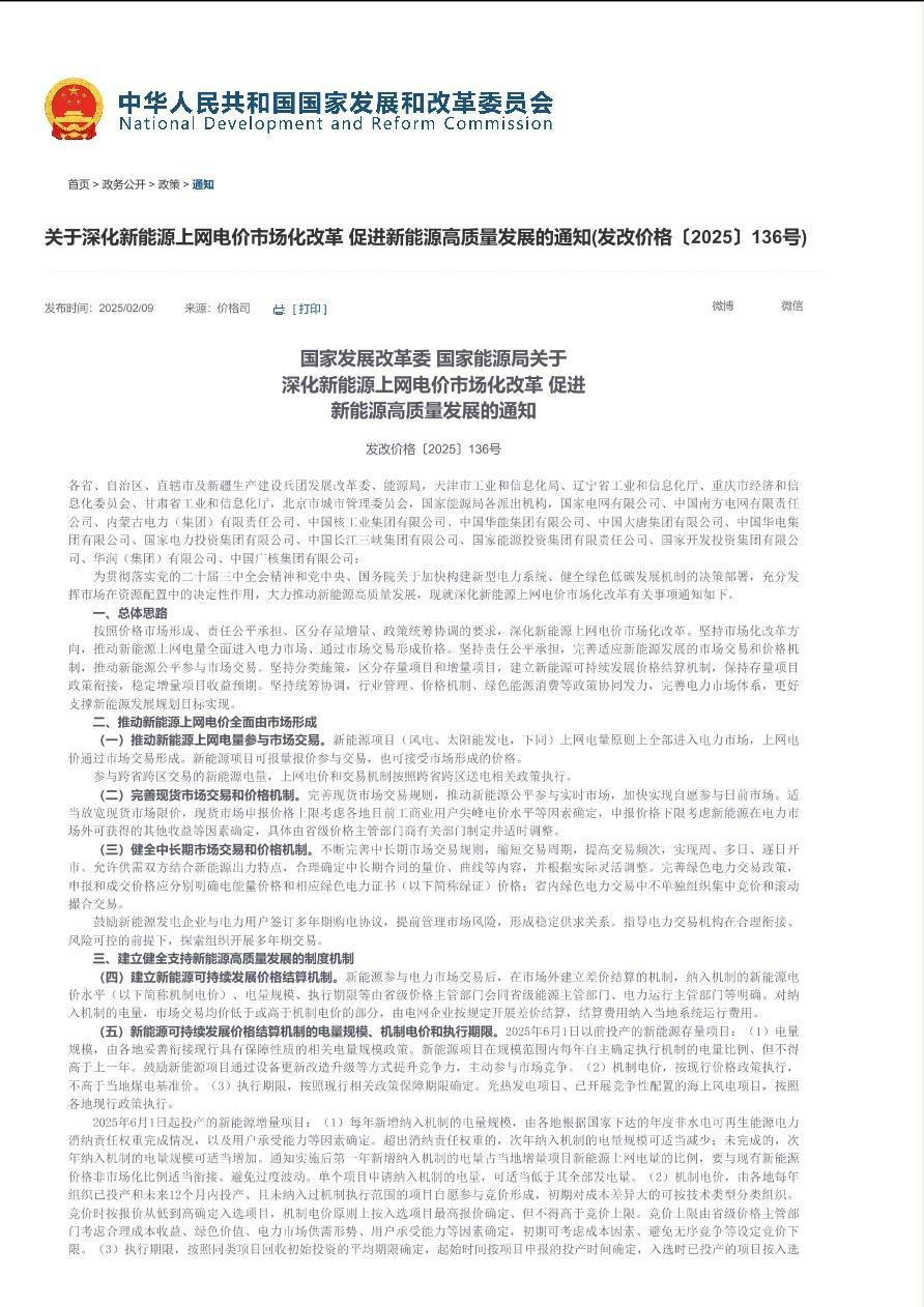 发改价格〔2025〕136号 国家发展改革委国家能源局关于深化新能源上网电价市场化改革促进新能源高质量发展的通知