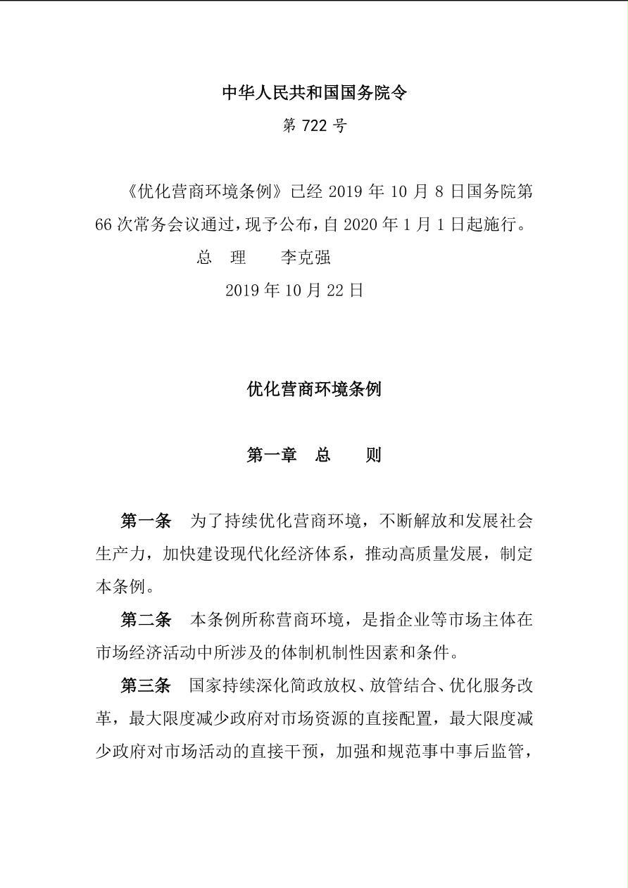 优化营商环境条例 中华人民共和国国务院令 第722号