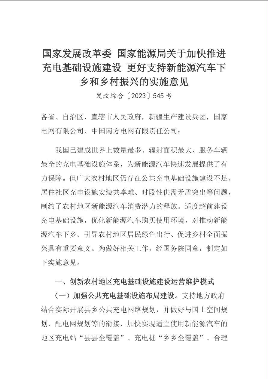 发改综合〔2023〕545号 国家发展改革委国家能源局关于加快推进充电基础设施建设更好支持新能源汽车下乡和乡村振兴的实施意见