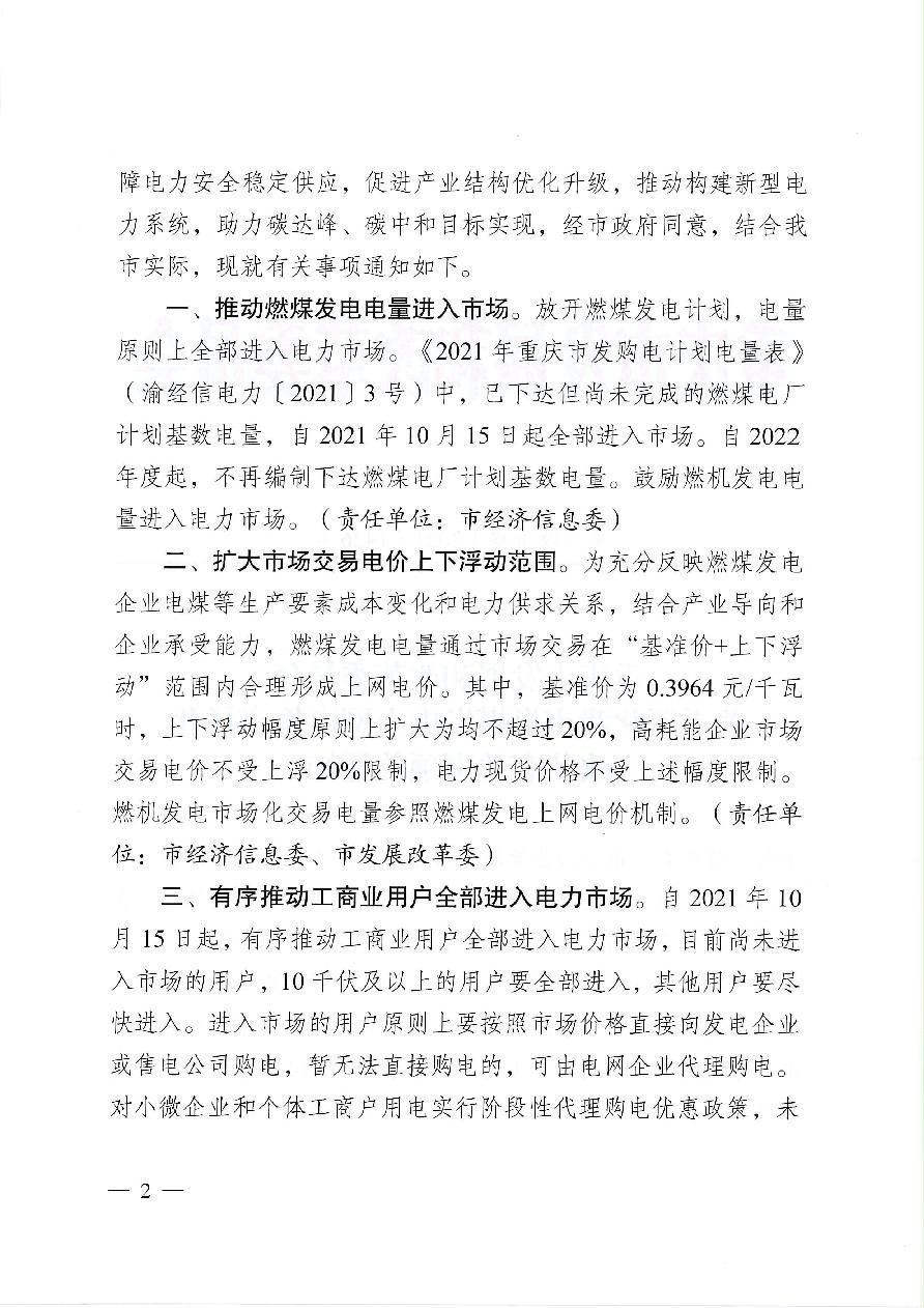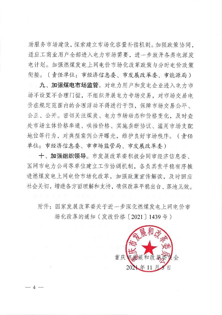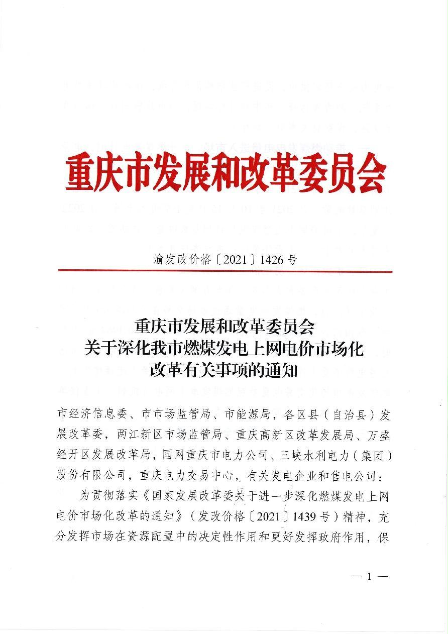 渝发改价格〔2021〕1426号 重庆市发展和改革委员会关于深化我市燃煤发电上网电价市场化改革有关事项的通知