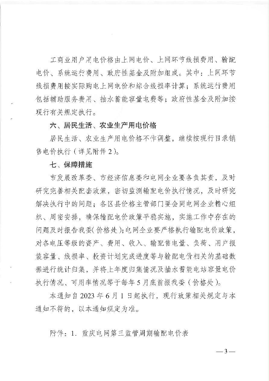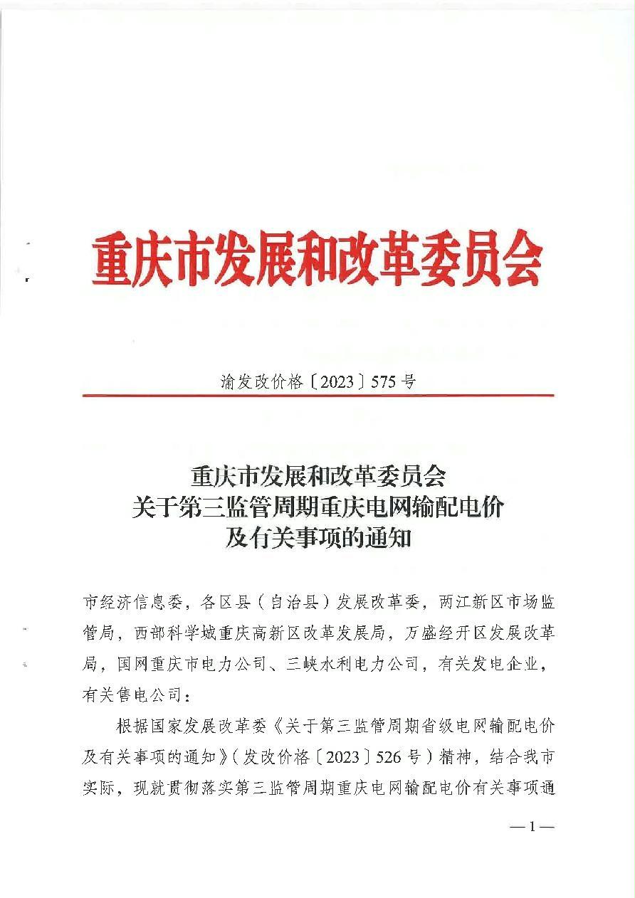 渝发改价格〔2023〕575号 重庆市发展和改革委员会关于第三监管周期重庆电网输配电价及有关事项的通知