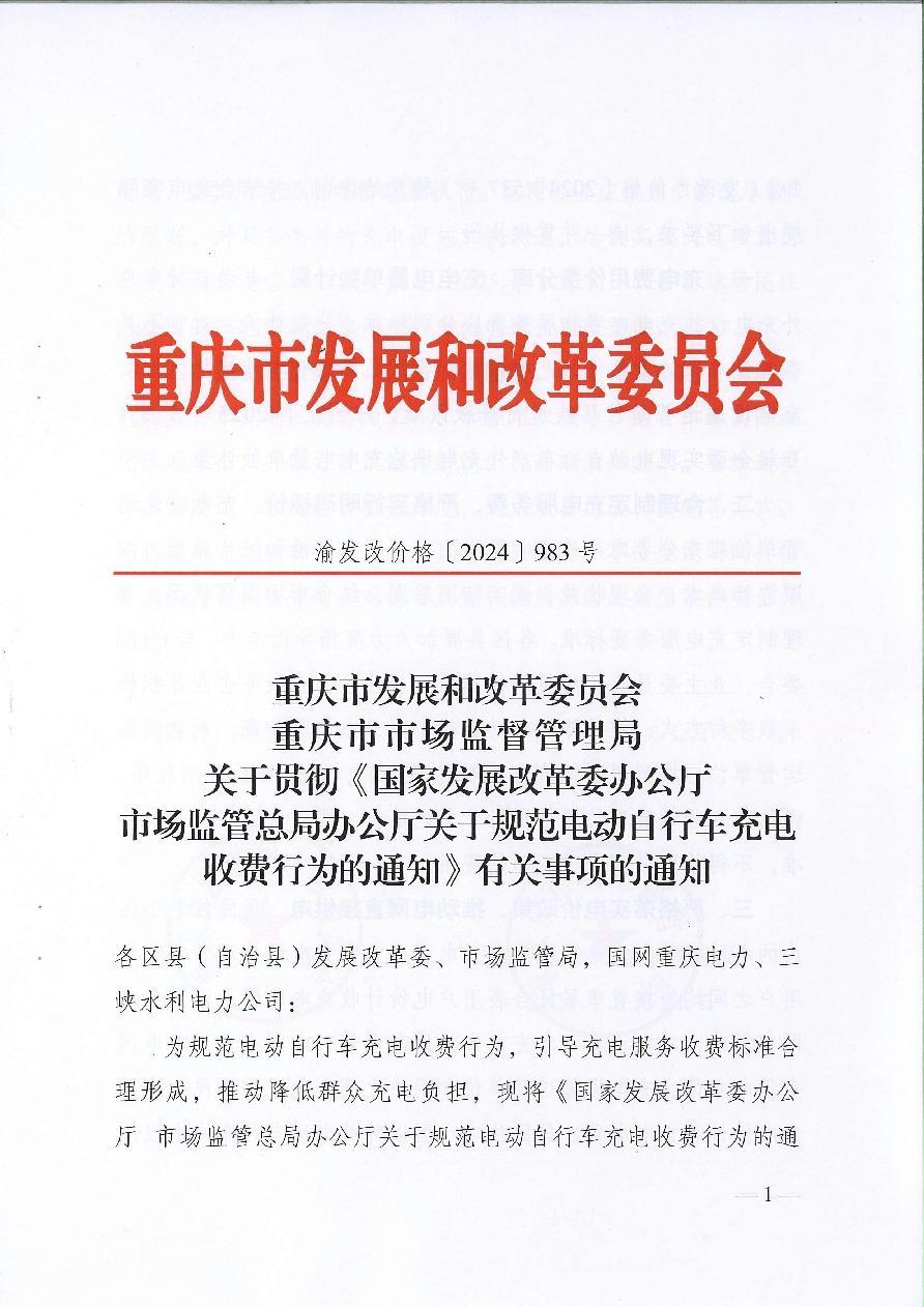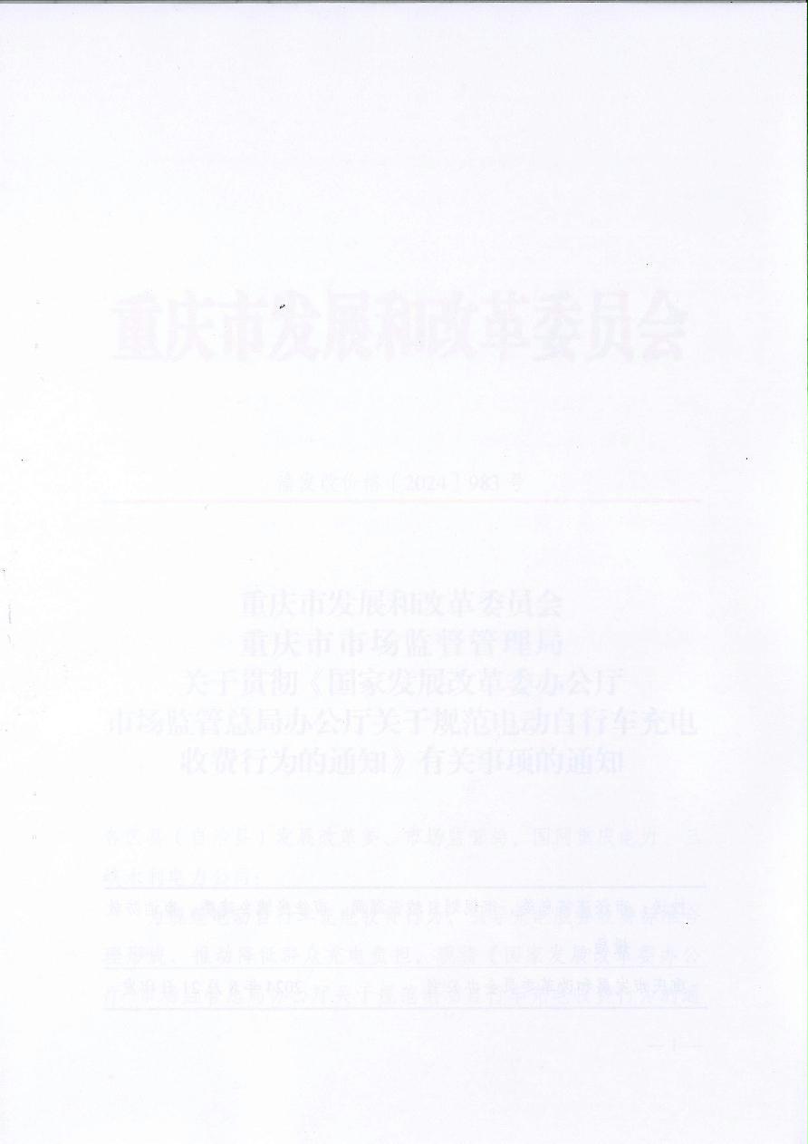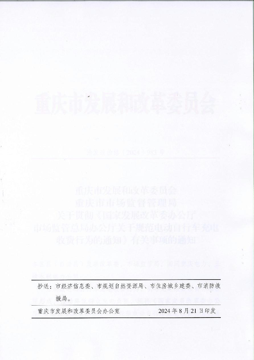 渝发改价格〔2024〕983号 关于贯彻《国家发展改革委办公厅市场监管总局办公厅关于规范电动自行车充电收费行为的通知》有关事项的通知