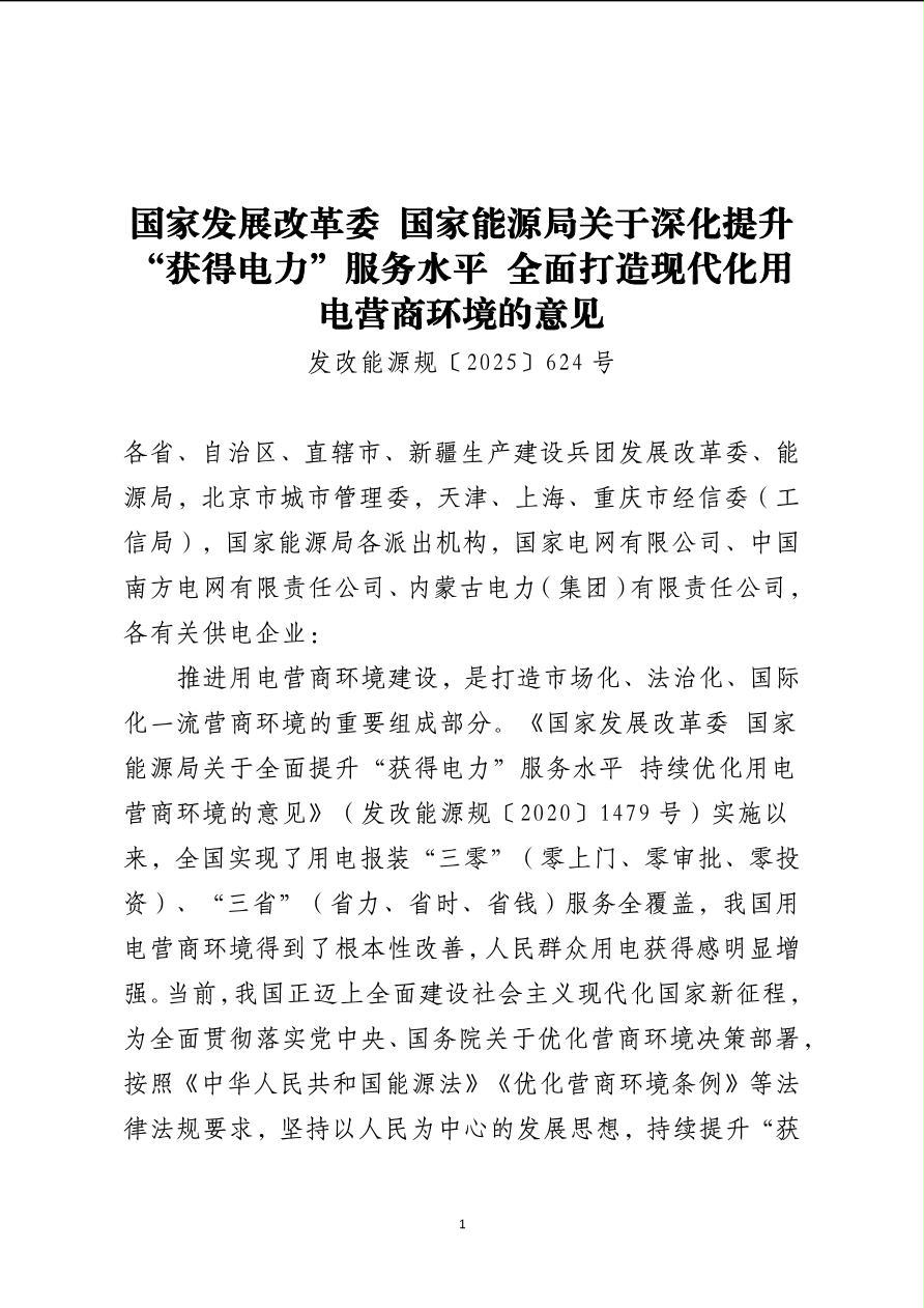 发改能源规〔2025〕624号 关于深化提升“获得电力”服务水平 全面打造现代化用电营商环境的意见