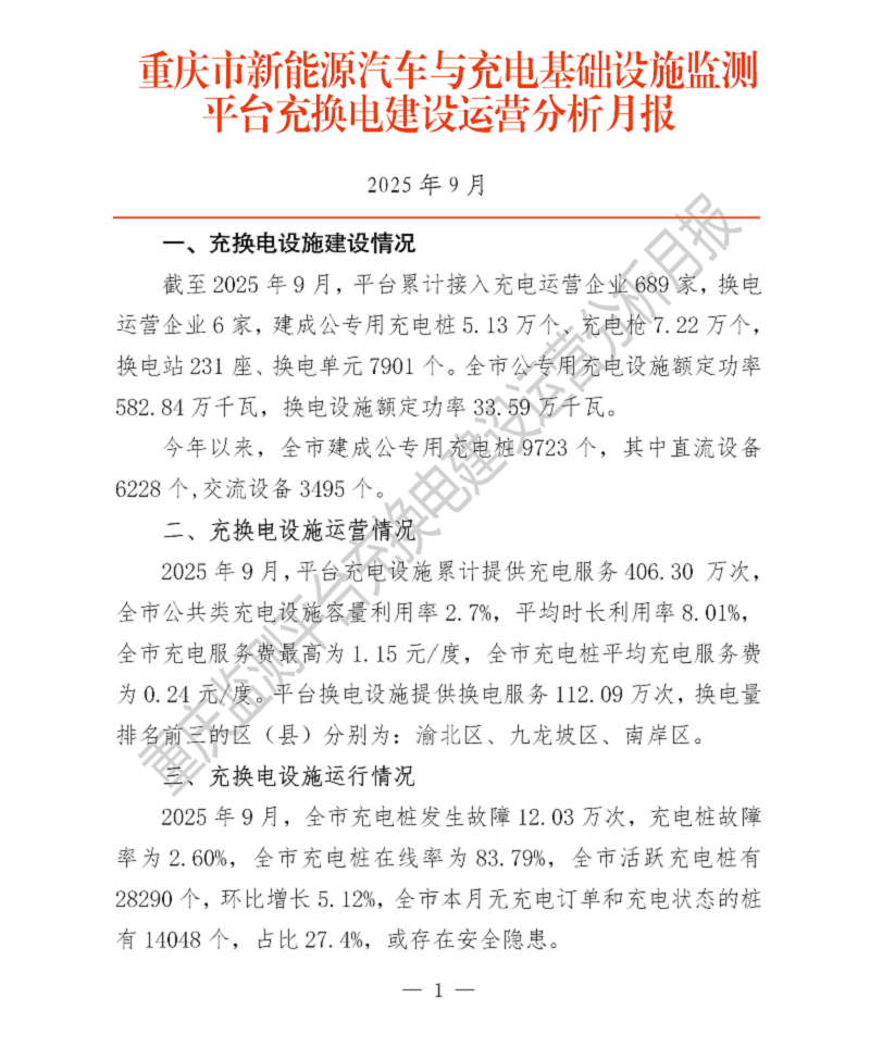 重庆市新能源汽车与充电基础设施监测平台充换电建设运营分析2025年9月简报