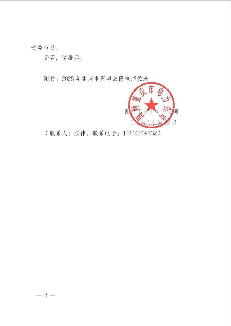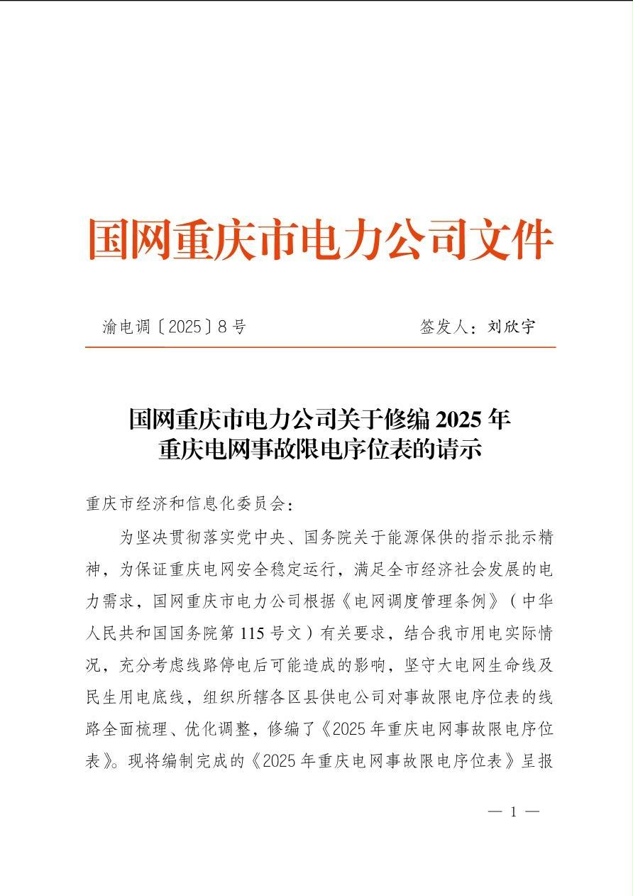 渝电调〔2025〕8号 国网重庆市电力公司关于修编2025年重庆电网事故限电序位表的请示