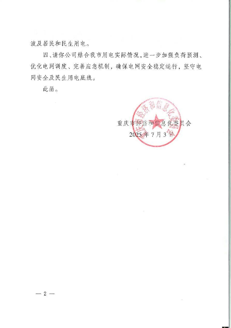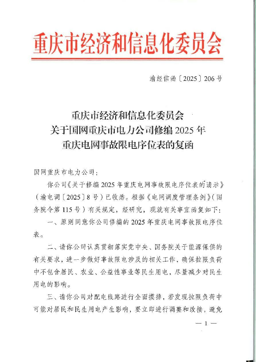 渝经信函〔2025〕206号 关于修编2025年重庆电网事故限电序位表的复函