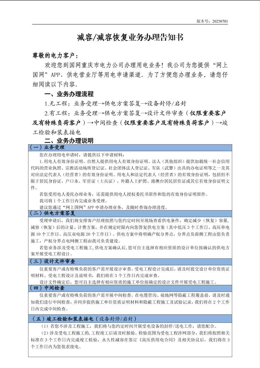 减容(减容恢复)业务办理告知书