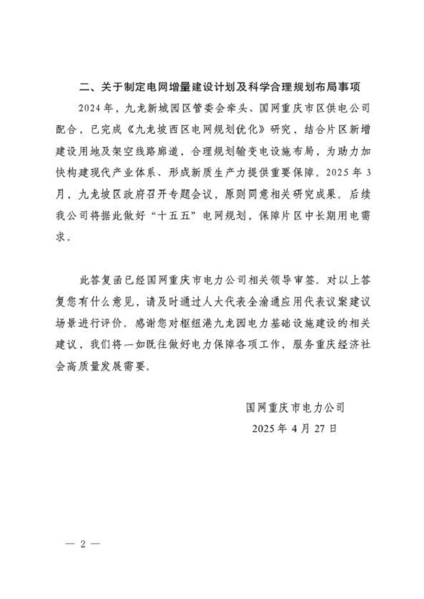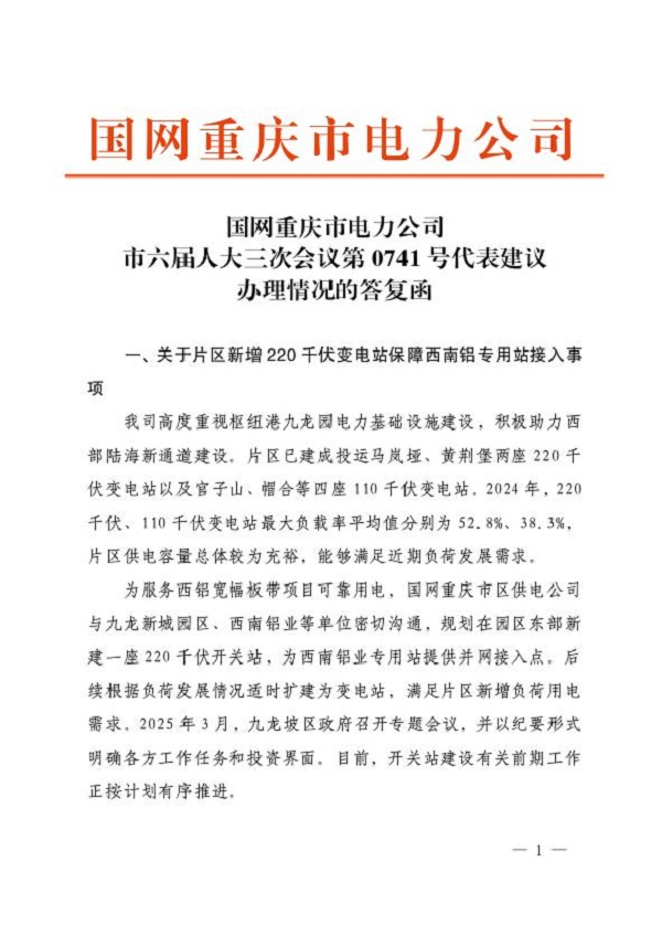 国网重庆市电力公司关于重庆市第六届人民代表大会第三次会议第0741号建议办理情况的答复函
