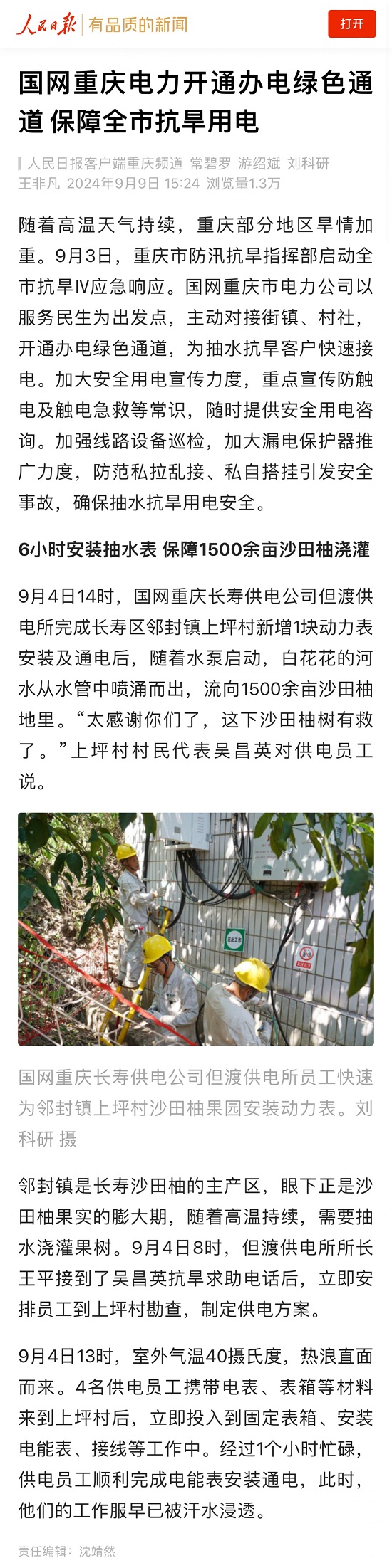 【人民日报】国网重庆电力开通办电绿色通道 保障全市抗旱用电