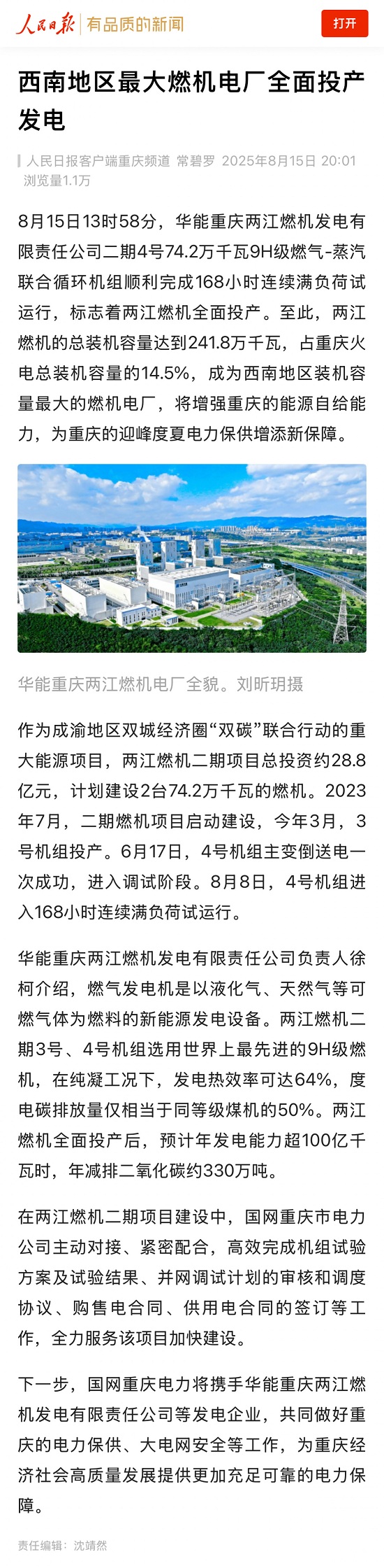 【人民日报】西南地区最大燃机电厂全面投产发电