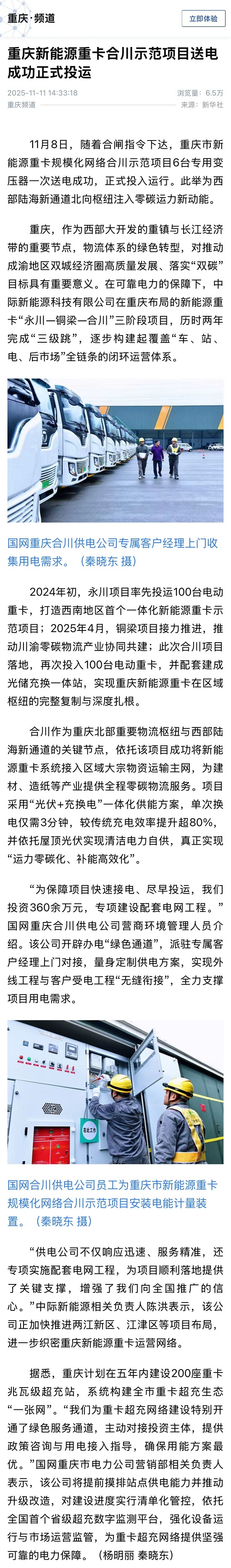 【新华社】重庆新能源重卡合川示范项目送电成功正式投运