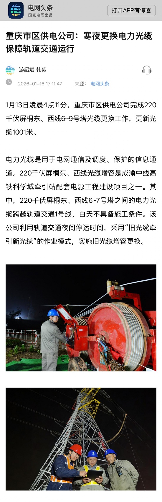 【电网头条】重庆市区供电公司:寒夜更换电力光缆 保障轨道交通运行