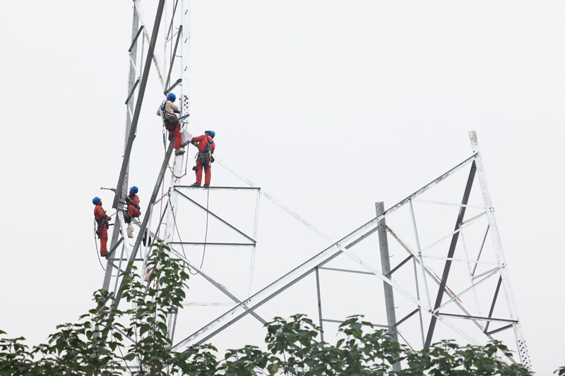 国网大足供电公司员工在龙水镇开展智凤220千伏输变电工程NA23铁塔组立工作。(罗永恒 摄)