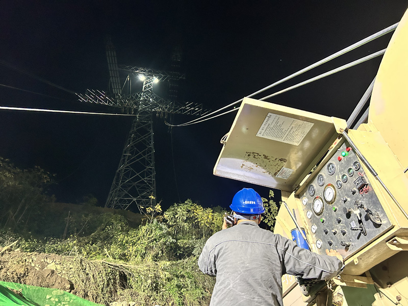 重庆送变电公司员工操作牵引机施放±800千伏哈密—重庆特高压直流输电线路工程(渝1标)N6323号塔导线。(唐甜甜 摄)