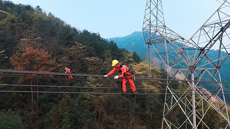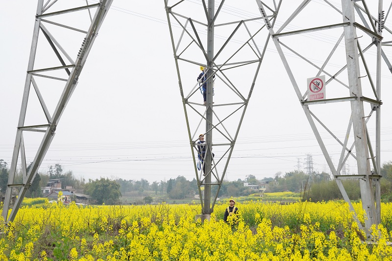 国网铜梁供电公司输电运检班员工在220千伏花全线41号塔处开展巡检工作。(颜玲莉 摄)