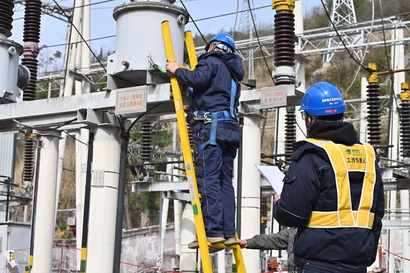 国网巫溪供电公司输变电运检中心变电检修班员工在110千伏镇泉变电站开展春检工作。(赵心朴 摄)