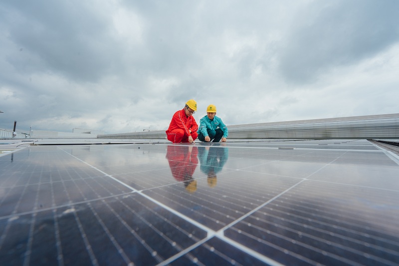 国网垫江供电公司员工在中材渝建(重庆)节能新材料有限公司对屋顶光伏开展安全检查。(舒淞 摄)