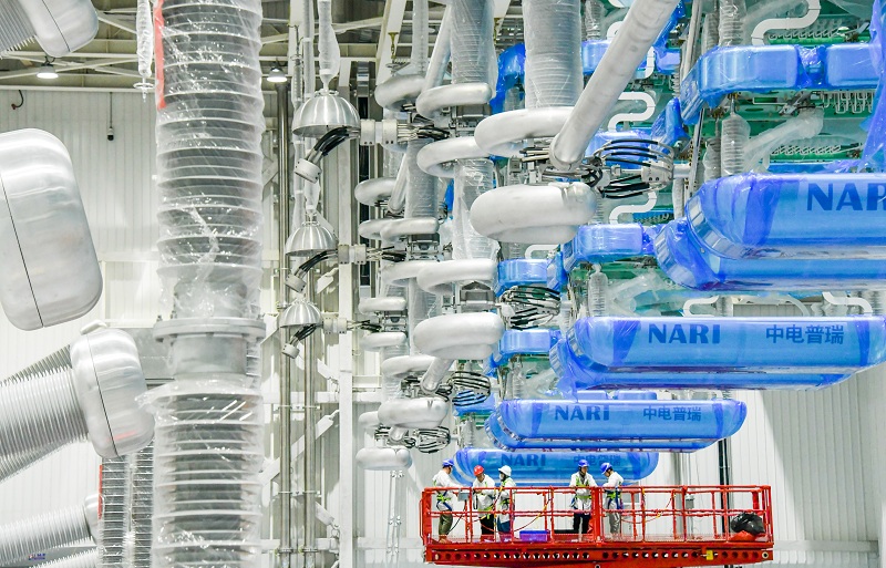 施工人员在“疆电入渝”工程±800千伏渝北换流站安装直流母线。(况敏 摄)