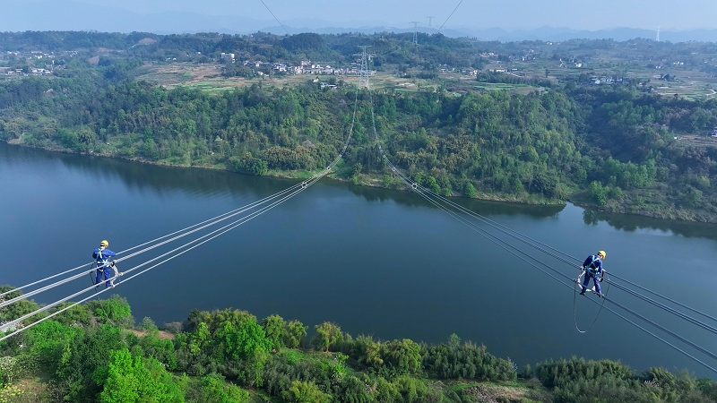 国网重庆超高压公司员工对哈密—重庆±800千伏特高压直流输电工程(重庆段)开展跨江走线验收作业。(李涛 摄)