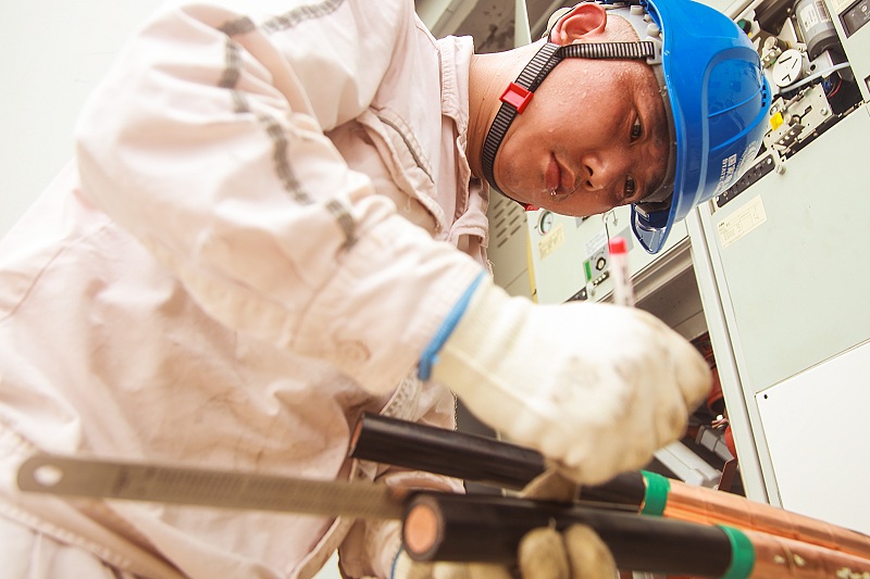 国网璧山供电公司员工在10千伏狮双线东林大道2号环网柜制作电缆终端头。(蒋佩 摄)