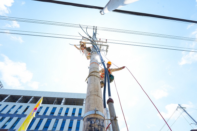 国网垫江供电公司员工在重庆渝盛阀门有限公司开展新装线路架设。(舒淞 摄)