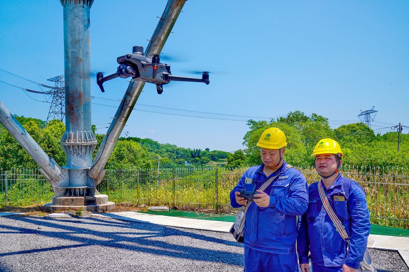 国网重庆超高压公司员工在金塘线928号长江大跨越塔基下起飞无人机,准备对塔基及通道进行激光扫描建模。(李涛 摄)