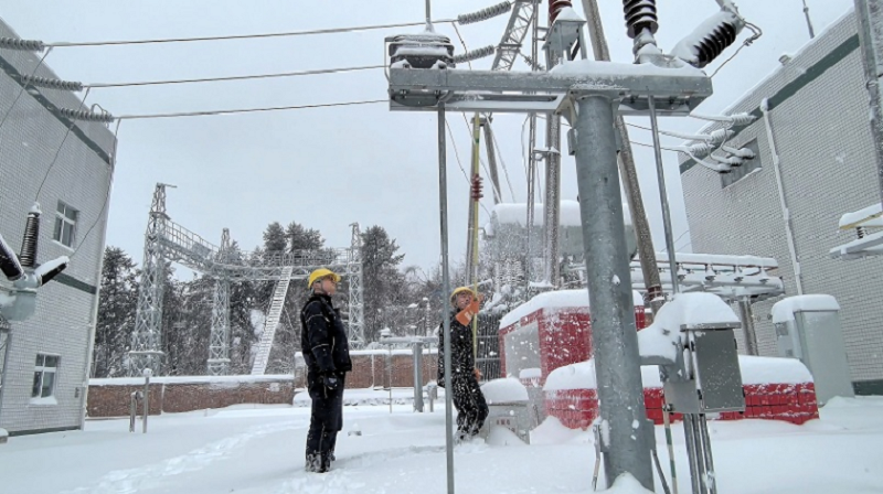 积雪与持续低温加持,变电站内的设备可能会出现覆冰情况,造成绝缘子闪络,影响供电可靠性。国网巫溪供电公司运维人员陈国、黄静和黄杨带好巡检装备,冒雪来到110千伏黑草坝变电站开展特巡,并使用特制的扫雪工具清除设备上的积雪,确保全站设备安全运行。